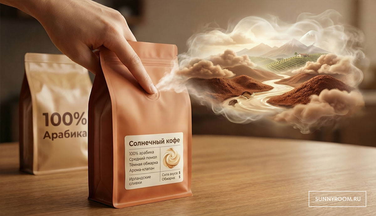 Два пакета кофе: один — просто «100% арабика»; другой — указана ферма и высота, матовый тёплый пакет с арома-клапаном: лёгкое нажатие — и тебя встречает свежая обжарка; аккуратный шрифт, маленькая карта вкуса с нотами какао и ирландских сливок. Второй спокойно просит дороже — и всё равно исчезает с полки первым: его уже выбрали глазами и ощущением надёжности.