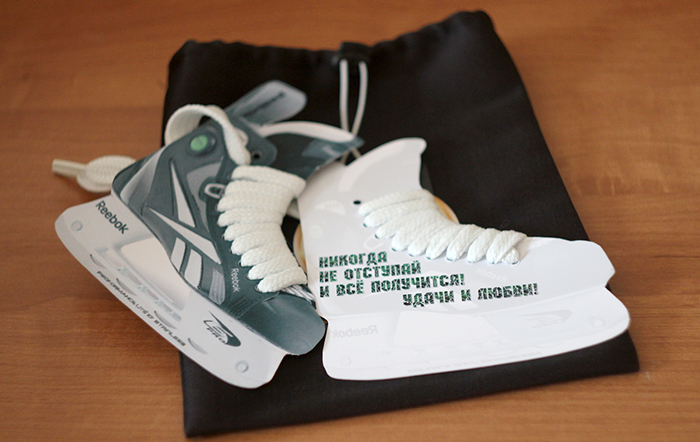 Сюрприз в стильном «мешочке для обуви»: коньки с пожеланиями.